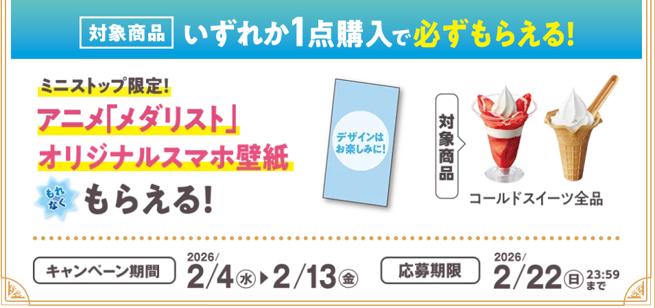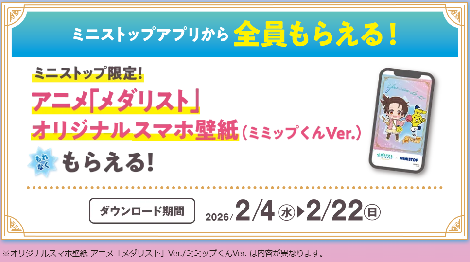 上記購入キャンペーンのほかに、ミニストップアプリでは「アニメ『メダリスト』オリジナルスマホ壁紙(ミミップくんVer.)」をもらえるダウンロードキャンペーンが、2月4日(水) ~ 2月22日(日)まで開催されます。