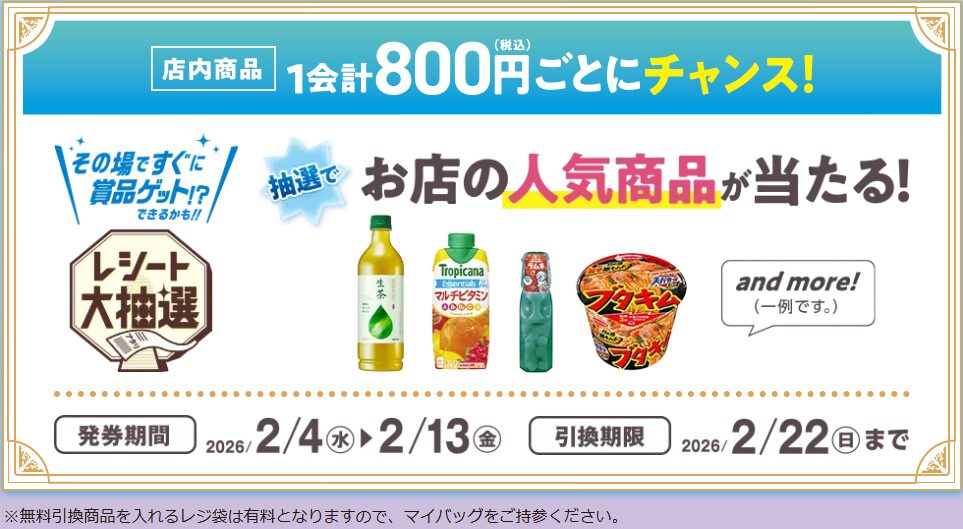 期間中に800円(税込)以上の買い物をすると自動で参加となり、レジにて自動で抽選を実施。