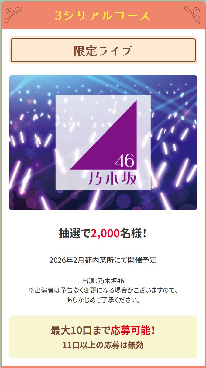 3シリアルで応募できるコースは、「乃木坂46 限定ライブ招待券」が抽選で2,000名に当たるというもの。