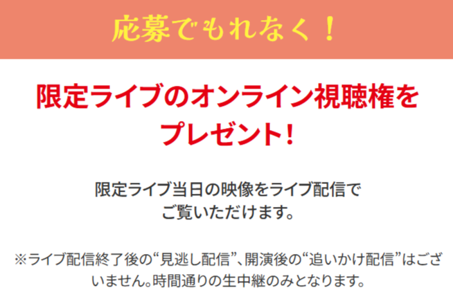 また、限定ライブコースに応募した人には、「限定ライブ オンライン視聴権」がもれなくプレゼントされるとのこと。