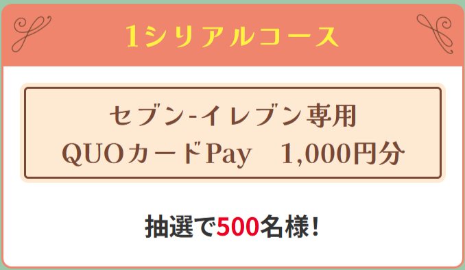 1シリアルで応募できるコースは、「セブン-イレブン専用QUOカードPay 1,000円分」が抽選で500名に当たるというもの。