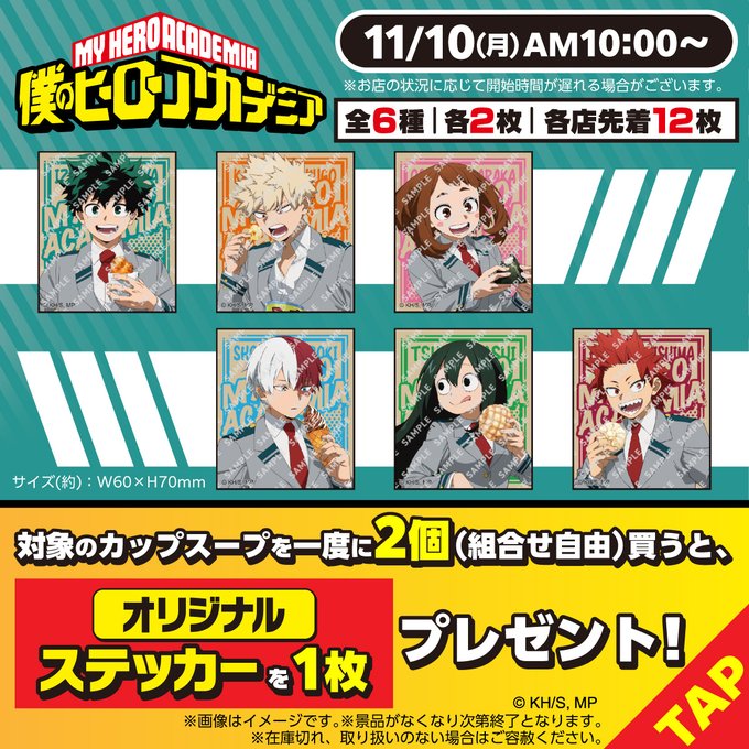 今回のキャンペーンは、期間中にセブンイレブンで対象のカップスープ一度に2個購入すると、「僕のヒーローアカデミア オリジナルステッカー」(全6種)を1枚もらえるというもの。