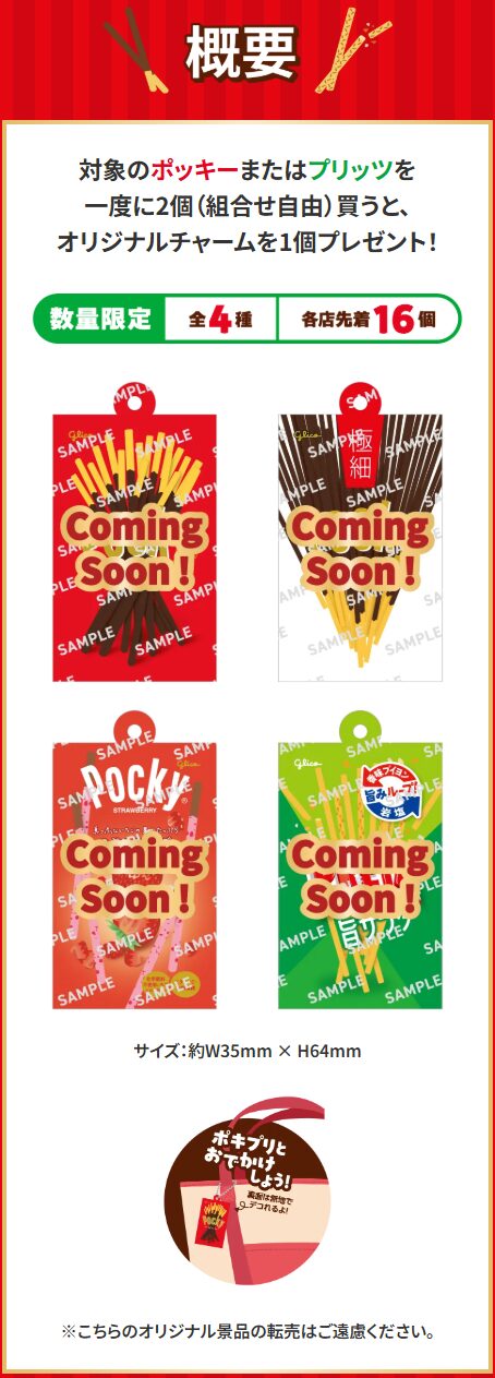 チャームは「ポッキー チョコレート」「ポッキー 極細」「つぶつぶいちごポッキー」「プリッツ 旨サラダ」の全4種類が用意され、好きなデザインを選んでもらえます。配布数は各店先着16個(各4個)。