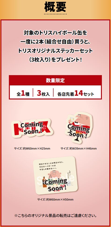 ステッカーセットはトリスウイスキーの広告キャラクター「アンクルトリス」(トリスおじさん)とトリスのロゴがセットになっており、3枚1セットで提供。配布数は各店14セットとされています。