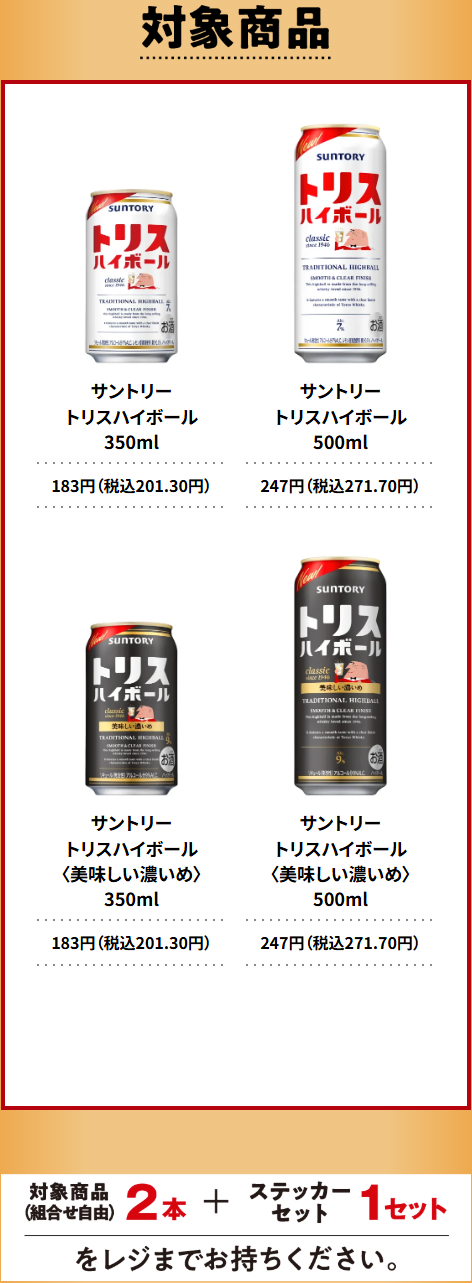 対象の商品は「サントリー トリスハイボール 350ml」(税込201.30円)など。配布期間は11月17日(月)までとされていますが、景品が無くなり次第、終了となります。