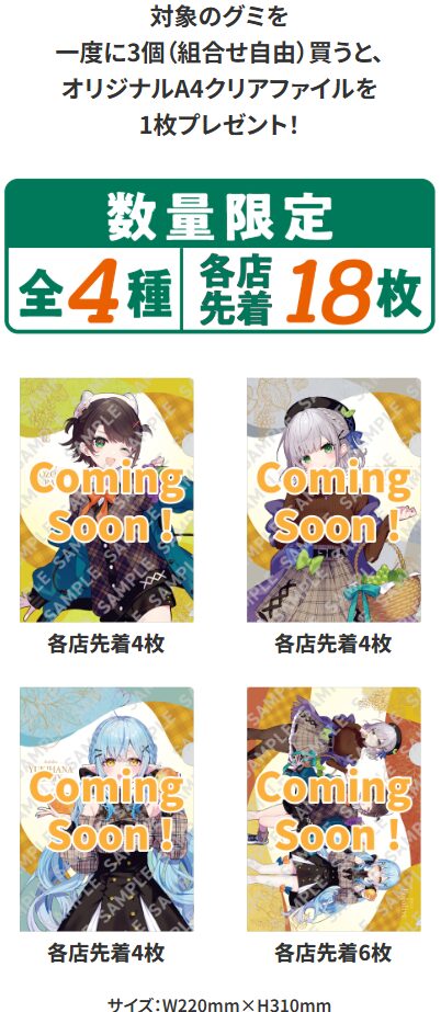 対象のグミ購入で「ホロライブ BIG3 A4クリアファイル」プレゼント