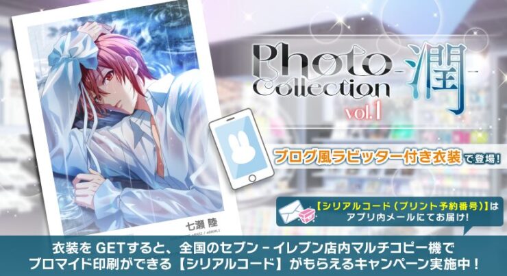 オーディションで[Photo Collection -潤-]衣装メンバーを入手すると、全国のセブン‐イレブン店内マルチコピー機でブロマイド印刷できる【シリアルコード(プリント予約番号)】をお届け!