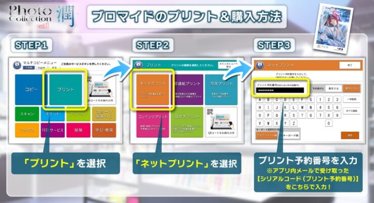 衣装を入手すると「シリアルコード(プリント予約番号)」がアプリ内メールで配信され、シリアルコードをセブン店内のマルチコピー機に入力することで、限定ブロマイドを購入・印刷できるそうです。