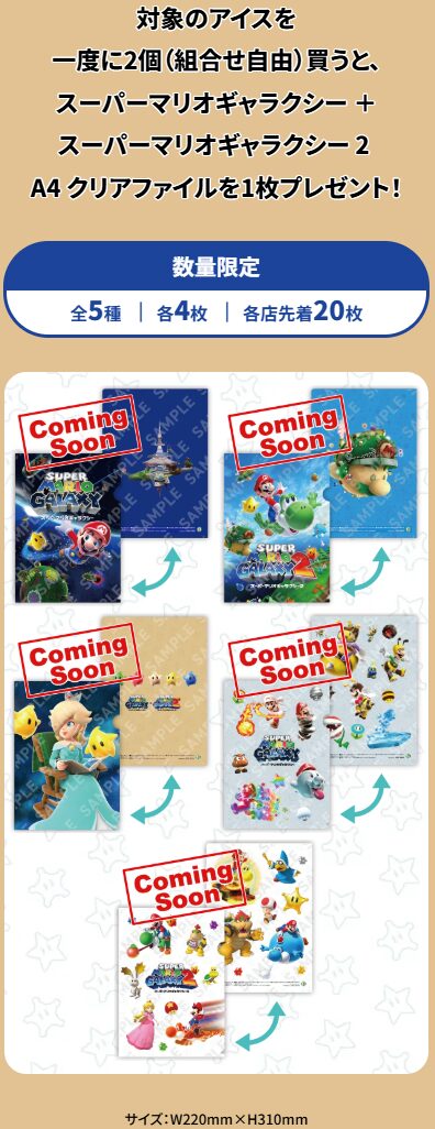 今回のキャンペーンは、期間中にセブンイレブンで対象のアイスを一度に2個購入すると、「スーパーマリオギャラクシー 1+2 A4クリアファイル」(全5種)を1枚もらえるというもの。