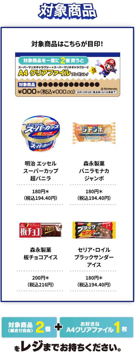 対象のアイス購入で「スーパーマリオギャラクシー 1+2 A4クリアファイル」プレゼント
