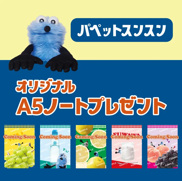 今回のキャンペーンは、期間中にセブンイレブンで対象の森永inゼリーを一度に2個購入すると、「パペットスンスン オリジナルA5ノート」(全5種)を1冊もらえるというもの。