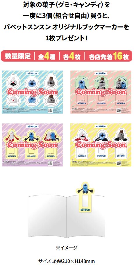 今回のキャンペーンは、期間中にセブンイレブンで対象のお菓子を一度に3個購入すると、「パペットスンスン オリジナルブックマーカー」(全4種)を1枚もらえるというもの。