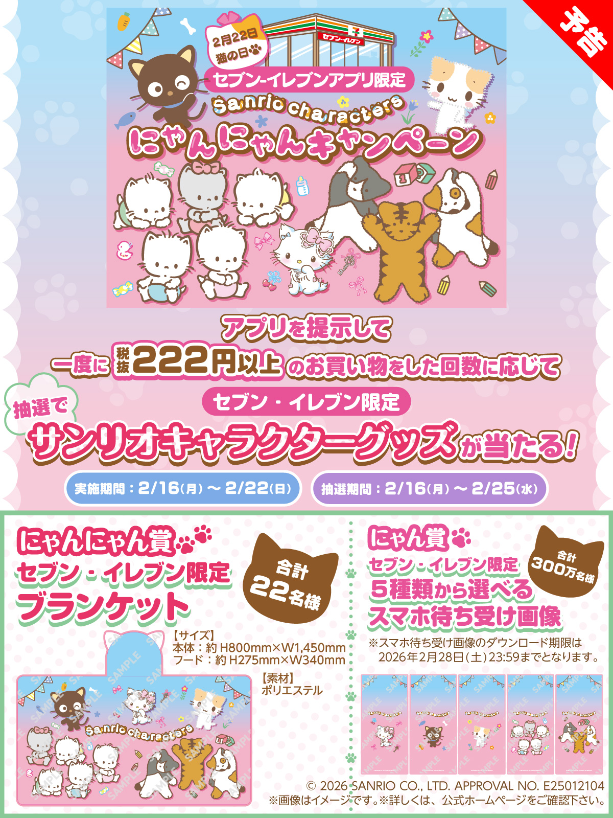 セブン-イレブンアプリ会員限定のキャンペーンで、アプリを掲示して税抜き222円以上の買い物をするとアプリ上で抽選に参加でき、「にゃんにゃん賞 セブン-イレブン限定 ブランケット」(抽選で合計22名)または「にゃん賞 セブン-イレブン限定スマホ待ち受け画像」(抽選で合計300万名)が当たる抽選に参加できます。
