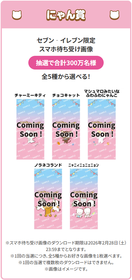 • にゃん賞 セブン-イレブン限定スマホ待ち受け画像」(全5種、抽選で合計300万名)