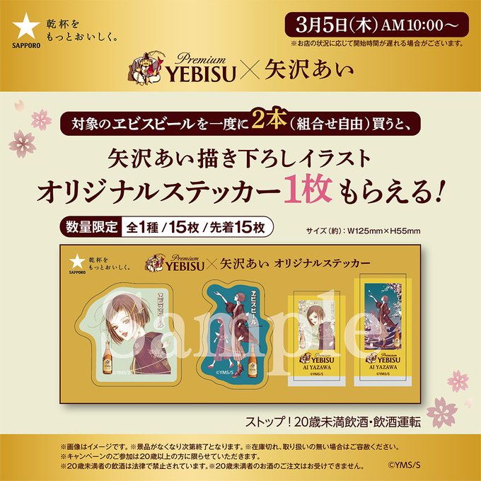 ステッカーは3月3日(火)から数量限定で発売される「ヱビスビール矢沢あい描き下ろしデザイン缶」のビジュアルを使用したもので、サイズはH125×W55mm。配布数は各店で先着15枚。