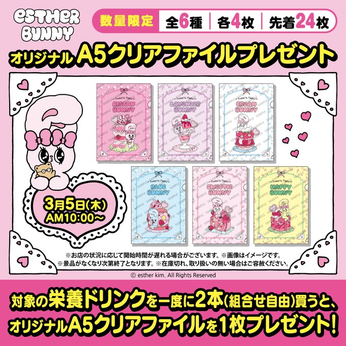 コラボキャンペーンの一環で「対象の栄養ドリンクを一度に2本買うと、エスターバニー オリジナルA5クリアファイルを1枚プレゼント!」キャンペーンが2026年3月5日(木) 10:00からスタートします。