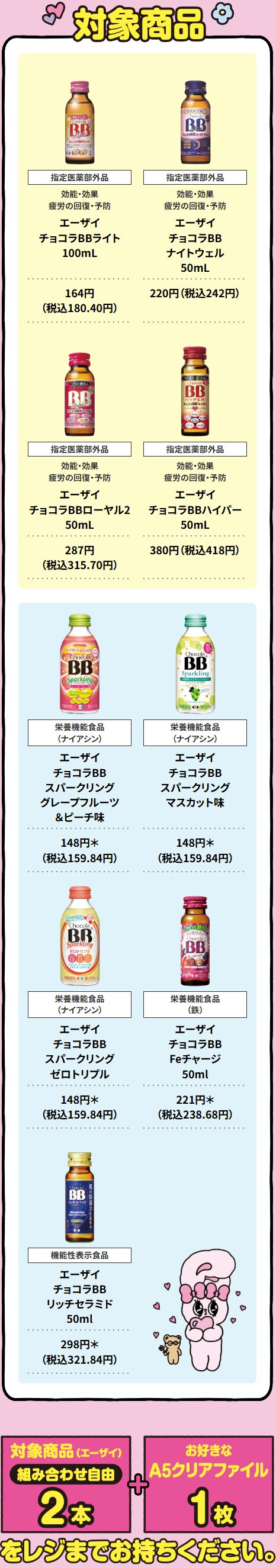 今回のキャンペーンは、期間中にセブンイレブンで対象の栄養ドリンクを一度に2本購入すると、「エスターバニー オリジナルA5クリアファイル」(全6種)を1枚もらえるというもの。