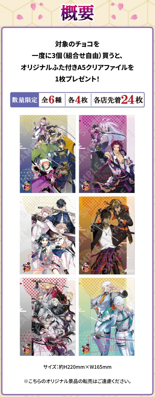 クリアファイルは全6種類が用意され、6つの刀派・グループが登場。好きなデザインを選んでもらえます。配布数は各店で先着24枚(各4枚ずつ)。
