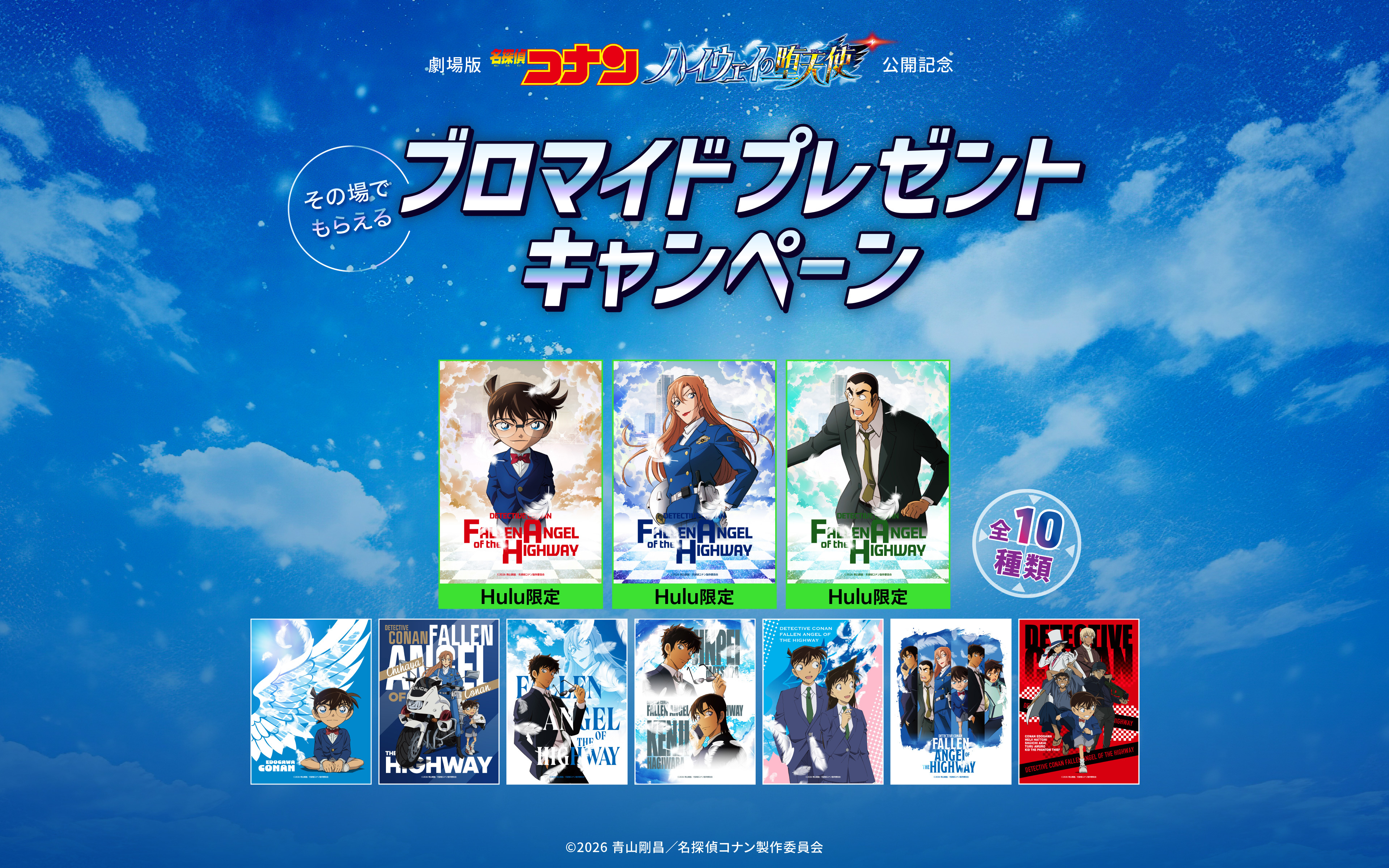 ブロマイドはセブンイレブンで販売されている「劇場版 名探偵コナン ハイウェイの堕天使 オリジナルブロマイド第1弾」にラインアップされているものと同デザインが採用されていますが、全10種のうち3種(江戸川コナン、荻原千速、横溝重悟のソロデザイン)については背景が異なる「Hulu限定デザイン」とされています。