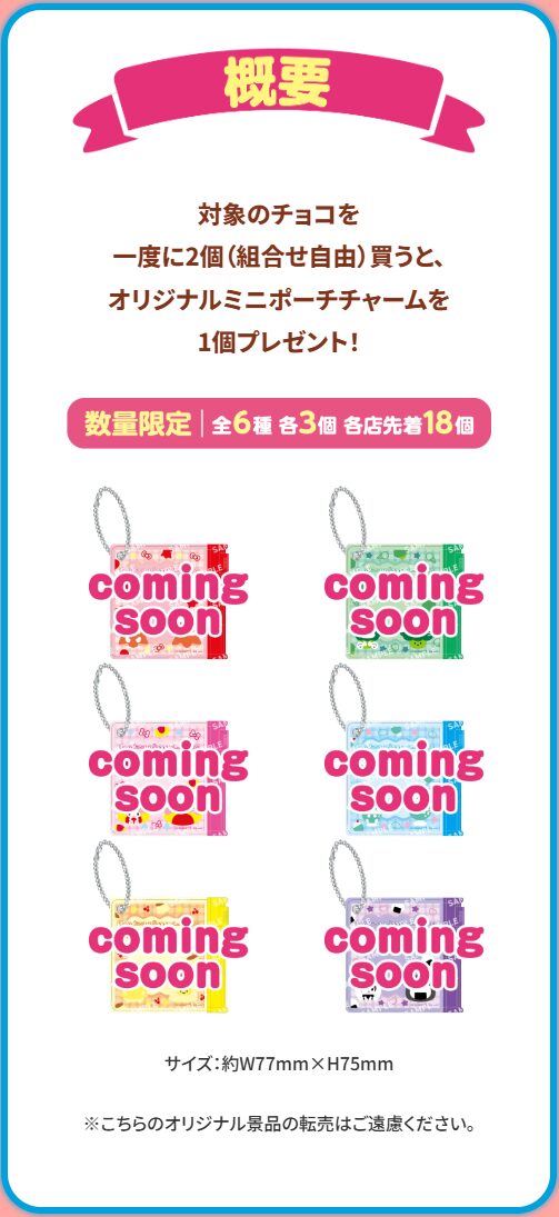今回のキャンペーンは、期間中にセブンイレブンで対象のチョコ菓子を一度に2個購入すると、「サンリオキャラクターズ×にっこりーノ ミニポーチチャーム」(全6種)を1個もらえるというもの。