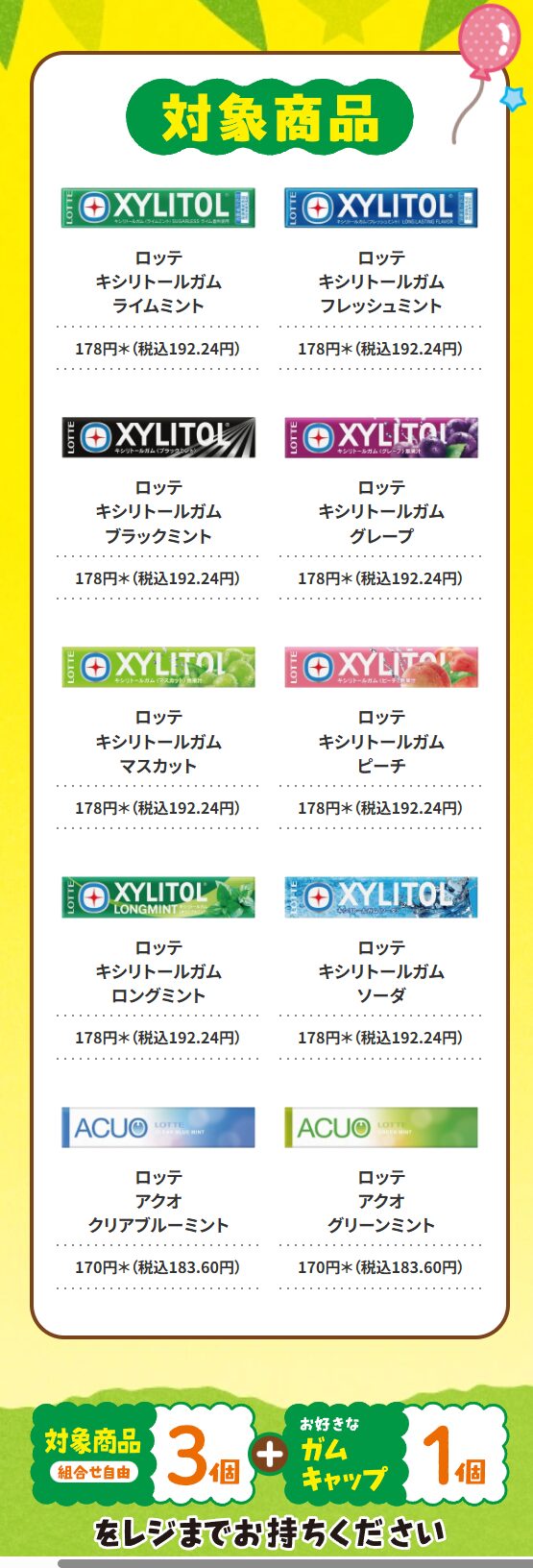 対象商品は「ロッテ ゼロ キシリトールガム ライムミント」(税込192.24円)など。配布期間は4月27日(月)までとされていますが、景品が無くなり次第、終了となります。