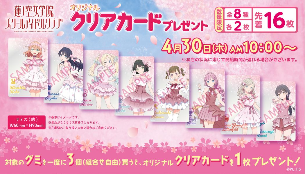 クリアカードは日野下花帆、百生吟子、村野さやか、徒町小鈴、大沢瑠璃乃、安養寺姫芽、桂城泉、セラス 柳田 リリエンフェルトの全8種類がラインアップされ、好きなキャラクターを選んでもらえます。配布枚数は各店先着16枚(各2枚)。