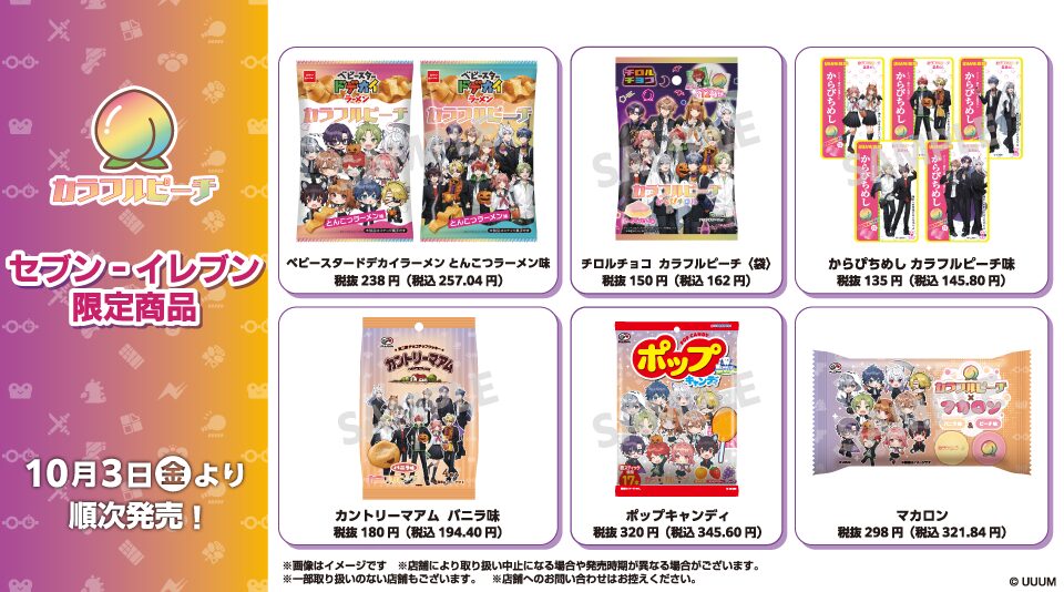 カラフルピーチとコラボしたお菓子がセブンイレブンの一部店舗で10月3日(金)から店頭販売。