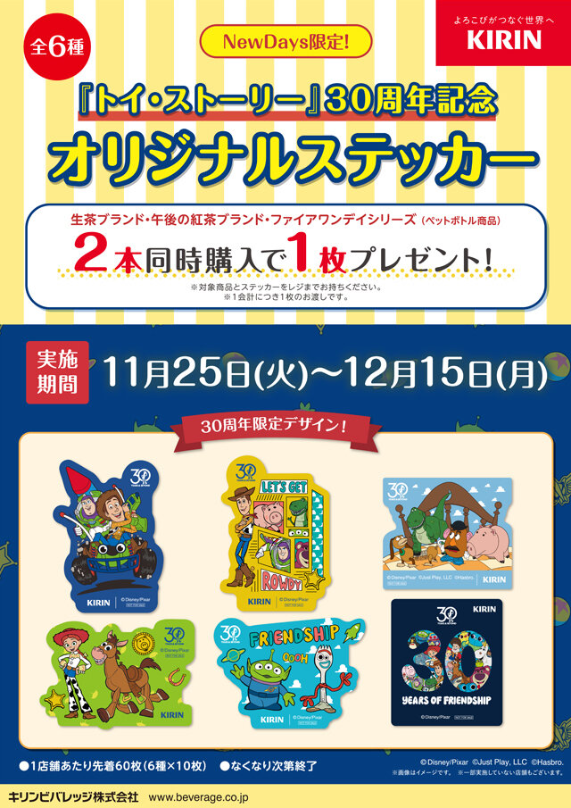 今回のキャンペーンは、期間中にNewDaysで対象の飲料を一度に2本購入すると、「NewDays限定『トイ・ストーリー』30周年記念オリジナルステッカー」(全6種)を1枚もらえるというもの。