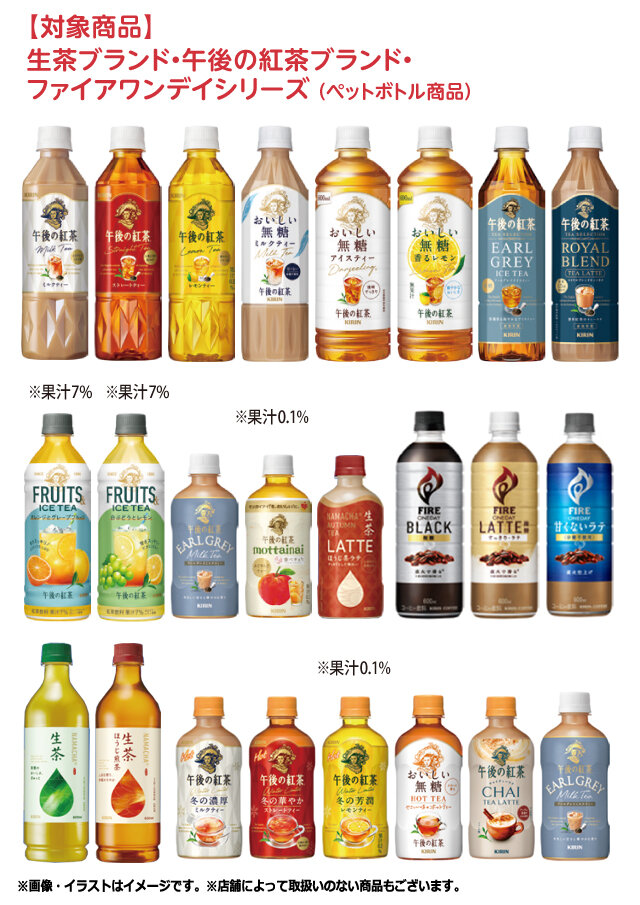 対象商品はキリンビバレッジの「生茶ブランド」「午後の紅茶ブランド」「ファイアワンデイシリーズ」(いずれもペットボトル商品)。キャンペーン期間は12月15日(月)までとされていますが、ステッカーが無くなり次第終了となります。