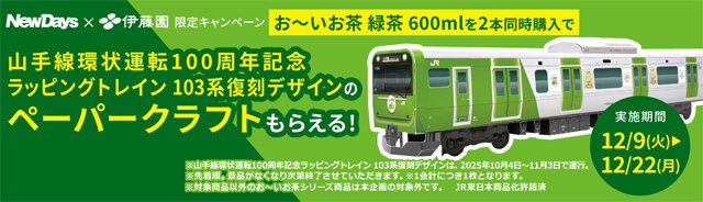 NewDaysで「山手線環状運転100周年記念 ラッピングトレイン 103系復刻デザイン ペーパークラフト」もらえる! 伊藤園 お~いお茶 購入キャンペーンが2025年12月9日スタート