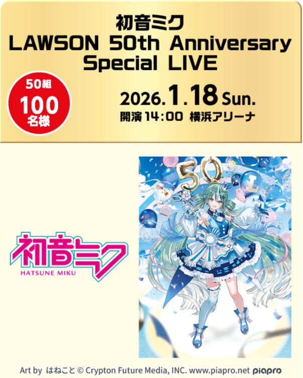 ローソン NEW 2025年11月1日 初音ミクやGLAYの『ローソン主催ライブ』ペアチケット当たる! ローソンアプリ限定「アプリでドリームチャレンジ 2025年11月度」が2025年11月1日スタート。イコラブ・ノイミー・ニアジョイ、新海誠作品フィルムコンサート含む全4種のチケットが総計600名にプレゼント