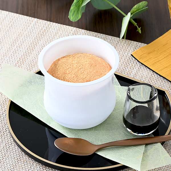 ホイップクリームときな粉をトッピングしたスプーンで食べるわらび餅です。別添の沖縄県産黒糖を使用した黒みつをかけてお召し上がりください。