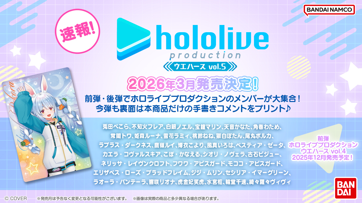 なお、今回のホロライブウエハースvol.5は後弾とされ、前弾の「ホロライブプロダクション ウエハースvol.4」が2025年12月に発売予定となっています。