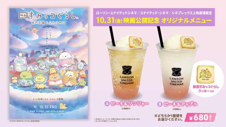 「映画 すみっコぐらし 空の王国とふたりのコ クッキー付きオリジナルドリンク」が、ローソン・ユナイテッドシネマ グループの一部映画館で2025年10月31日(金)から販売が開始されます。価格は680円(税込)。