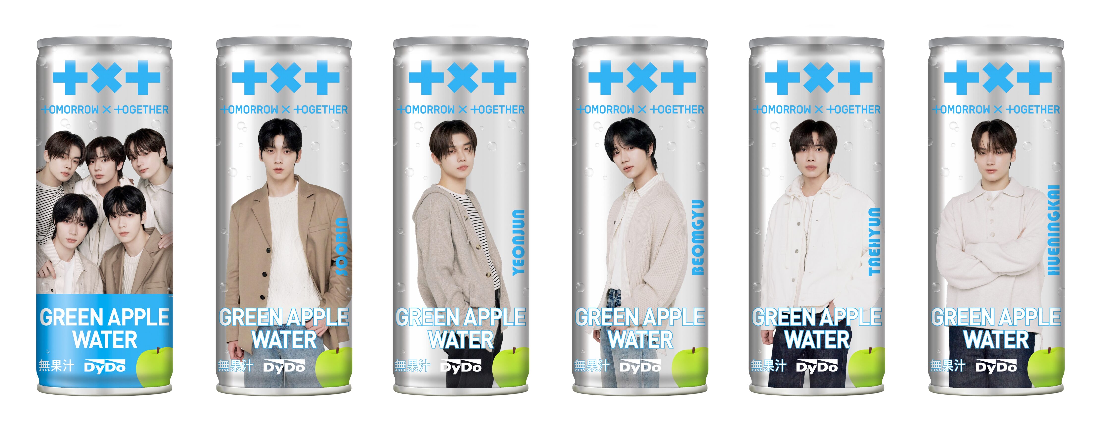 「ダイドー TOMORROW X TOGETHERグリーンアップルウォーター」は、TXTメンバーが缶側面にデザインされた、グリーンアップル味の缶飲料。