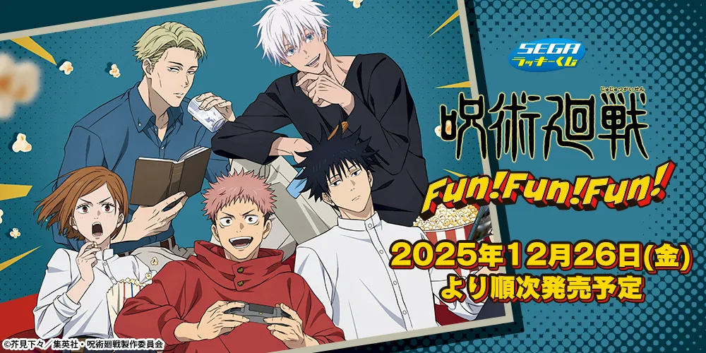 TVアニメ『呪術廻戦』の新作キャラクターくじがコンビニのローソンなどで登場。 「セガ ラッキーくじ『呪術廻戦 Fun!Fun!Fun!』」が2025年12月26日(金)から順次販売が開始されます。
