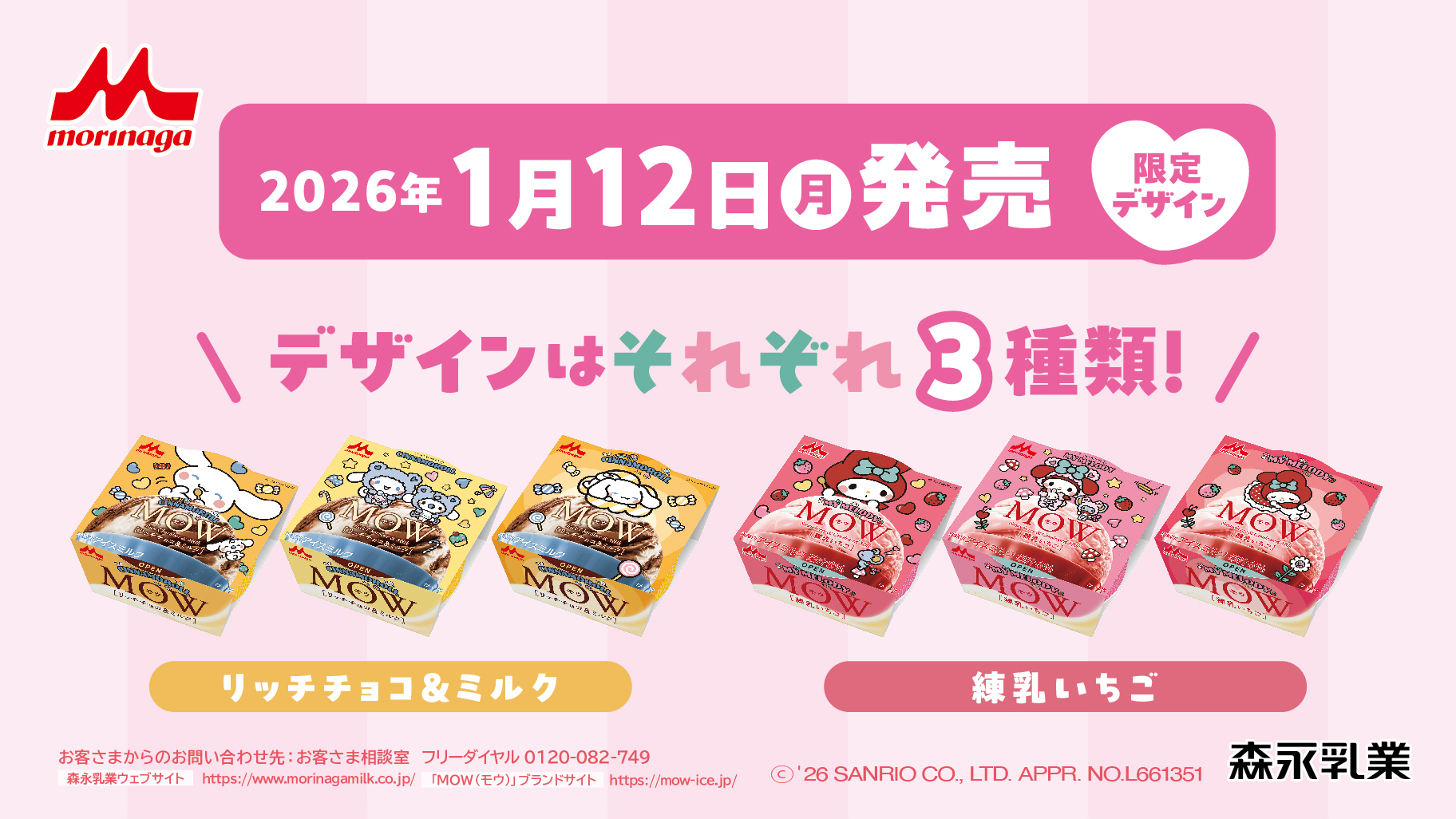 サンリオコラボパッケージを採用した「MOW(モウ) リッチチョコ&ミルク」「MOW(モウ) 練乳いちご」が、コンビニなどで2026年1月12日(月)から販売が開始されます。価格は各税抜き180円。