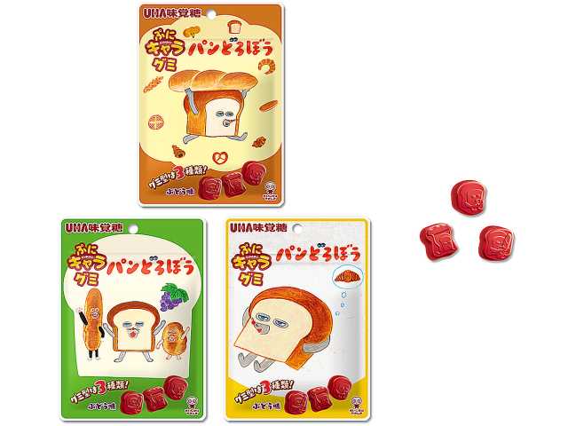 UHA味覚糖「ぷにキャラグミ パンどろぼう」は、パンどろぼうの形をした可愛らしいグミ。パンどろぼう達が描かれた可愛いパッケージが採用され、グミの形も3種類用意されています。