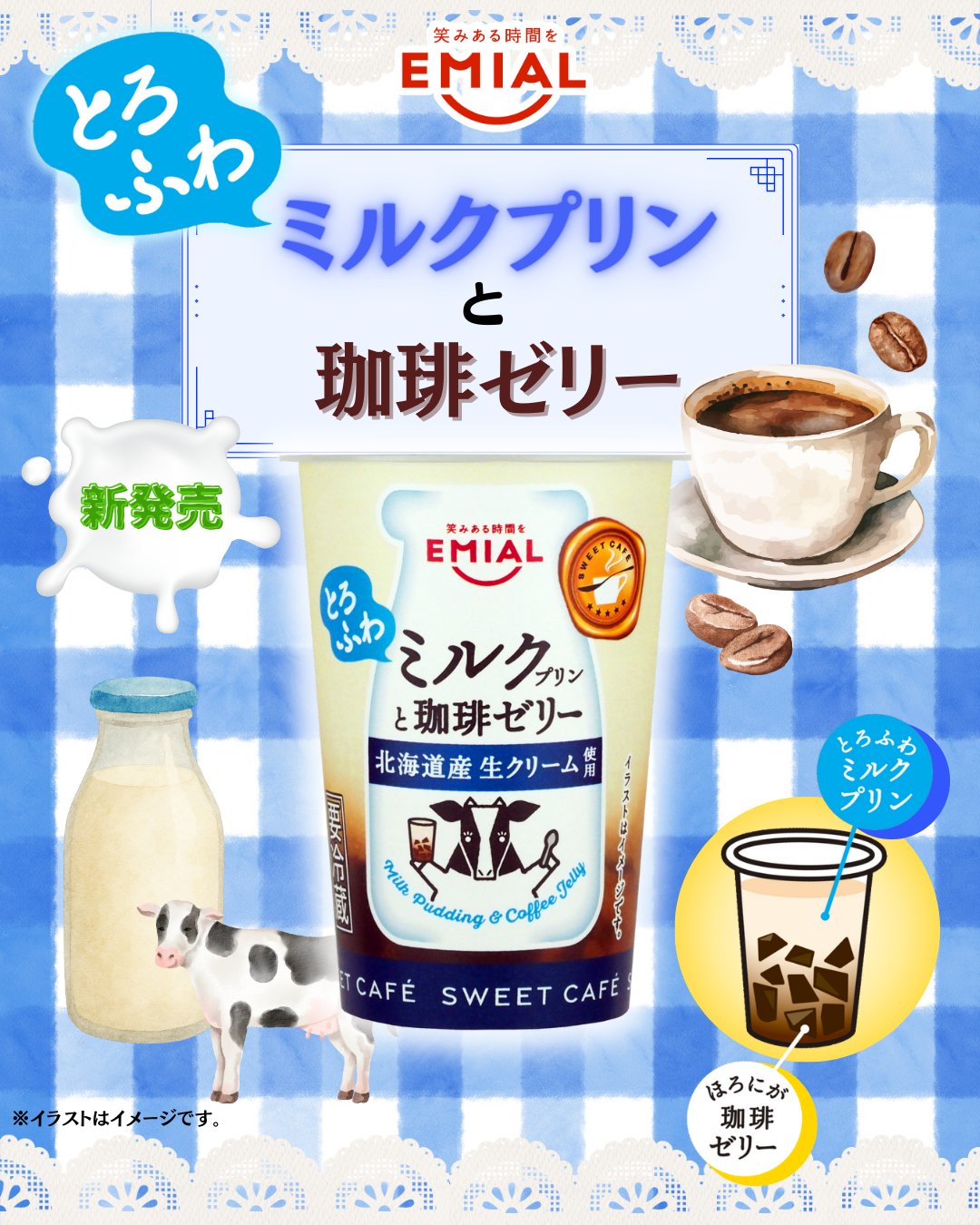 EMIAL(安曇野食品工房)の新作デザートがコンビニのローソンでも登場、「とろふわミルクプリンと珈琲ゼリー」が2026年1月20日(火)から販売が始まっています。販売価格は185円(税込)。