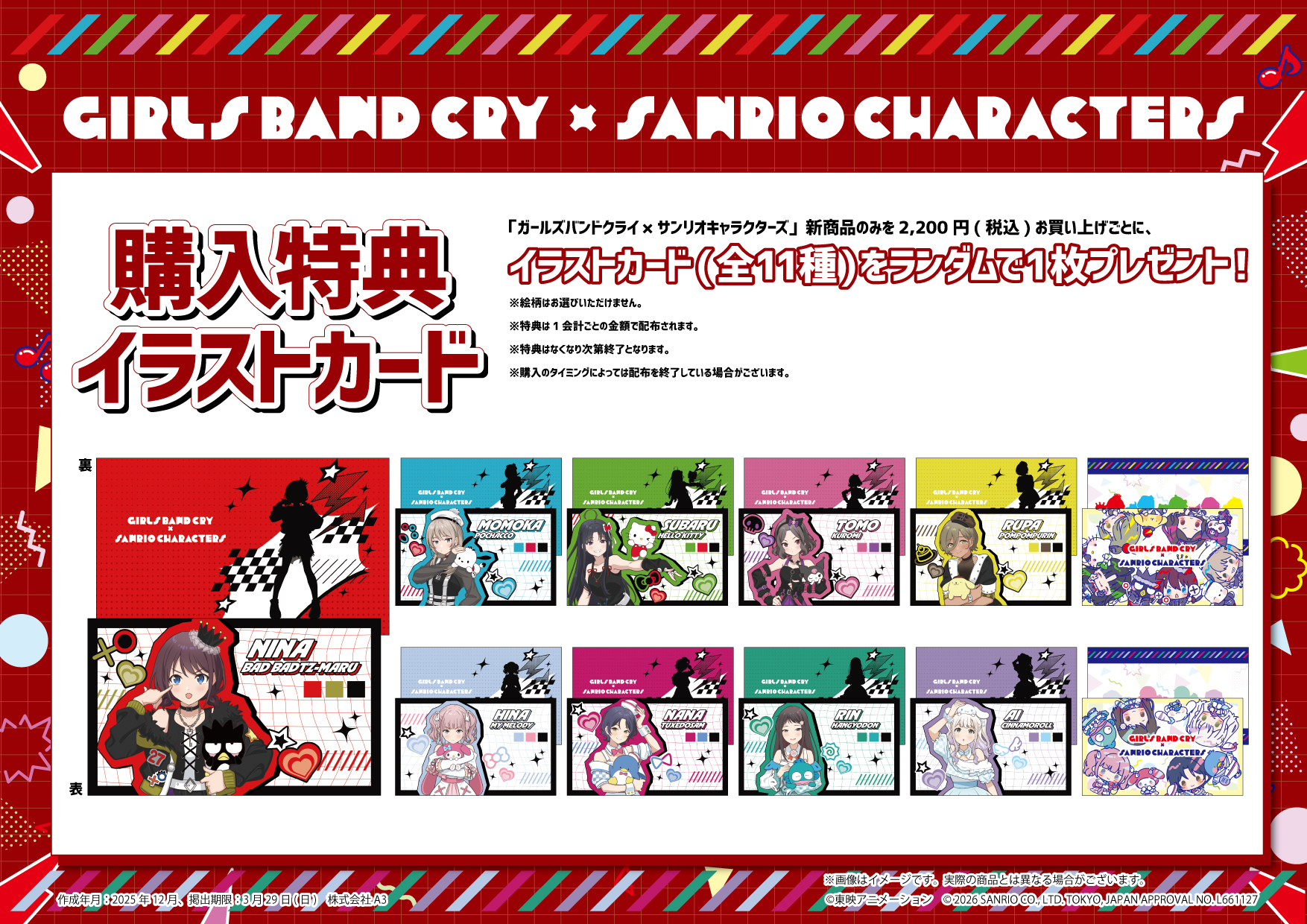 上記コラボグッズの新商品を2,200円(税込)購入するごとに、ガールズバンドクライ×サンリオキャラクターズコラボの「イラストカード」(全11種)をもらえるキャンペーンが2月27日(金)からスタート。