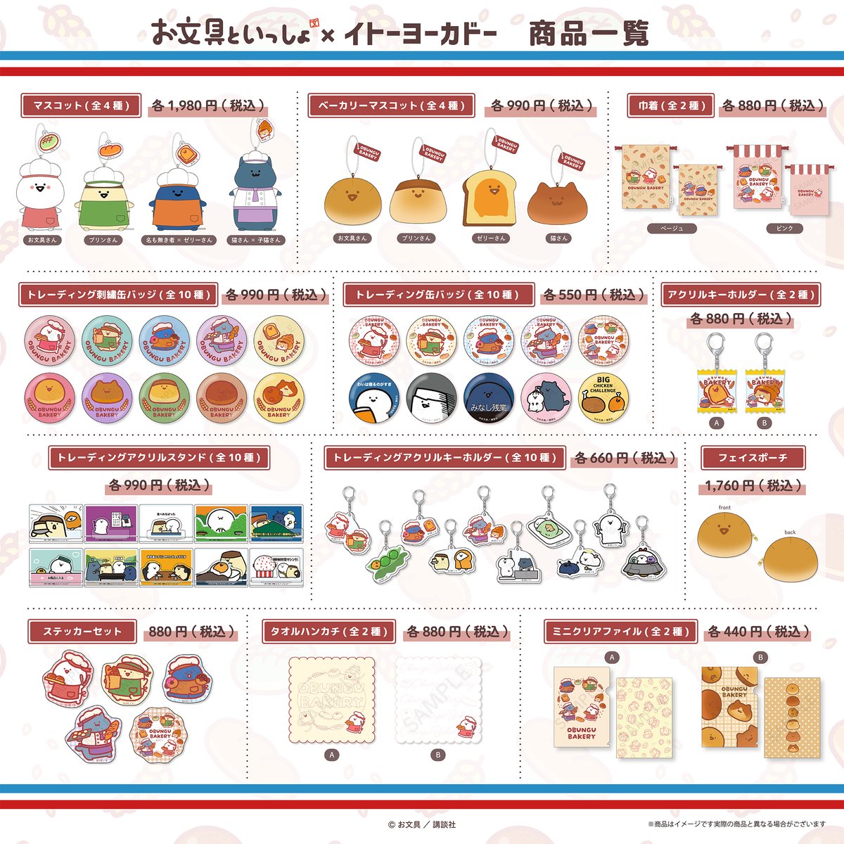今回、イトーヨーカドーで販売される「お文具といっしょ×イトーヨーカドー」コラボグッズは、パン屋さんで働くお文具さんたちの可愛い「マスコット」「ベーカリーマスコット」「トレーディングアクリルスタンド」「フェイスポーチ」など12アイテム。