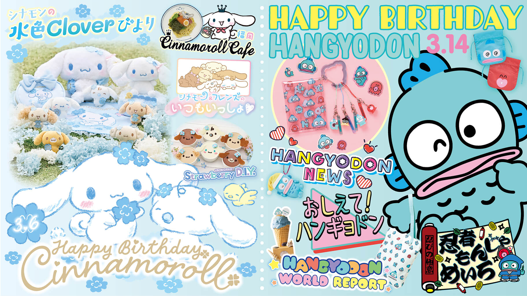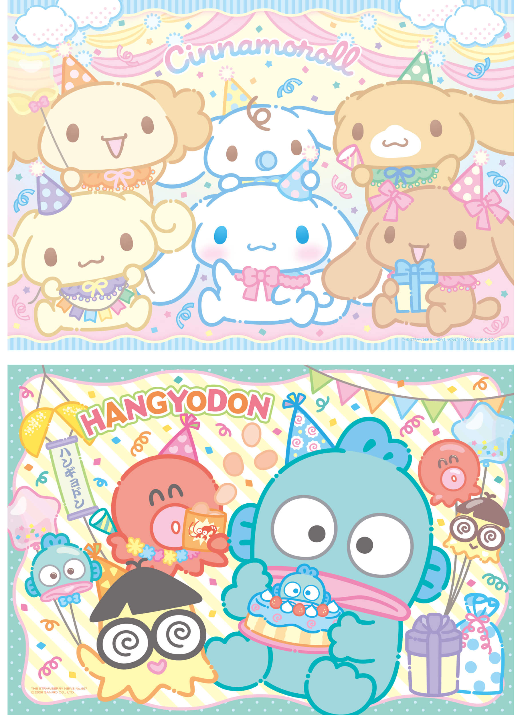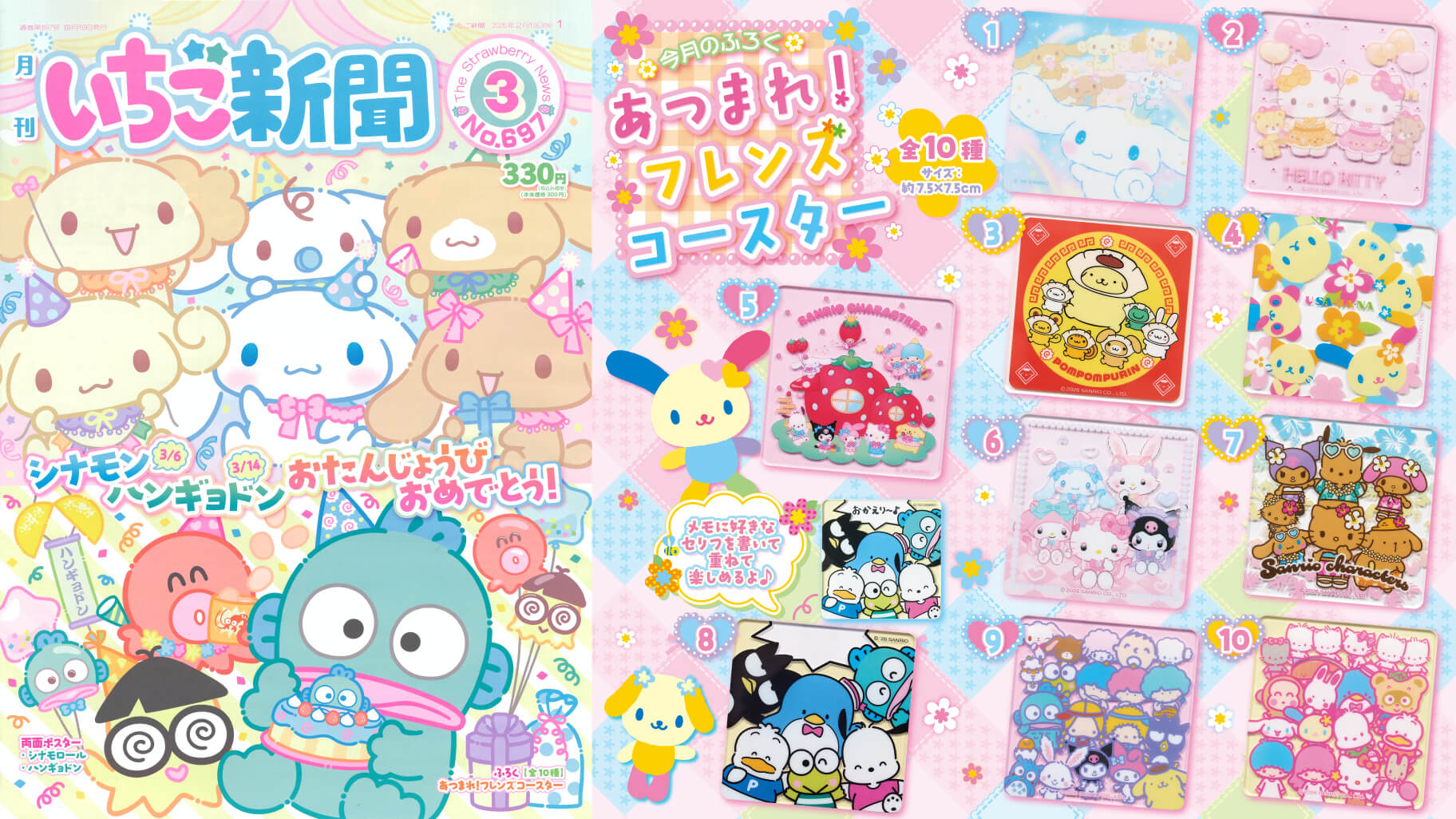 いちご新聞 2026年3月号では、3月6日(金)に誕生日を迎える「シナモン」(シナモロール)と3月14日(土)に誕生日を迎える「ハンギョドン」のW誕生日を特集。