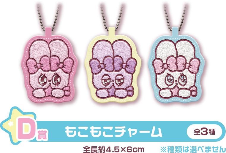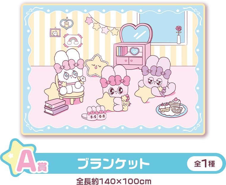 賞品ラインアップはA賞~F賞とラストラッキー賞が用意され、A賞は「ブランケット」、B賞は「くっつきマスコット」、C賞は「ふわふわポーチ」、D賞は「もこもこチャーム」、E賞は「刺繍缶バッジ」、F賞は「ハンドタオル」となっています。
