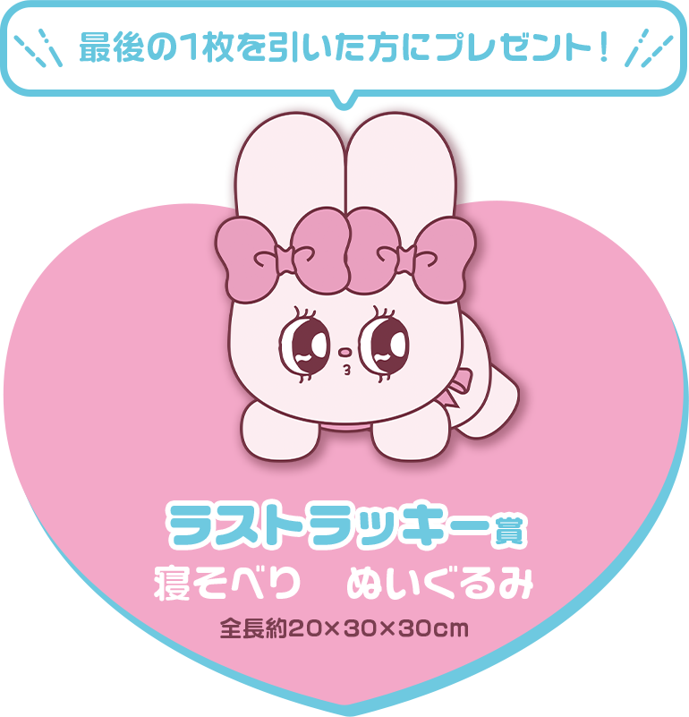 最後の1個を引くと手に入るラストラッキー賞については、「寝そべり ぬいぐるみ」となっています。