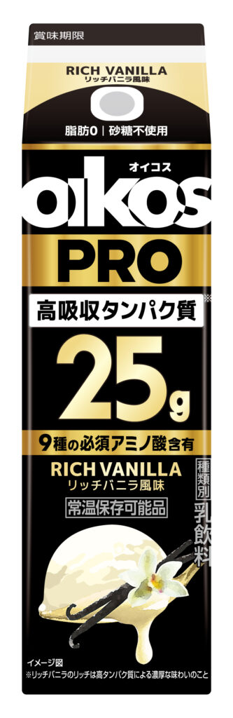 「オイコス PROプロテインドリンク 高吸収タンパク質25g リッチバニラ風味」は、1本で「オイコス プロテインドリンク」シリーズ最多のプロテイン25gを摂取できるという乳飲料。