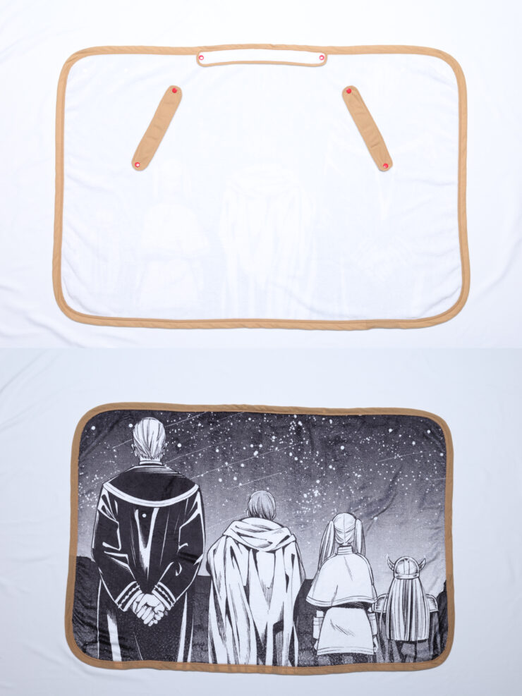 また、反対面にはヒンメル、フリーレン、ハイター、アイゼンの勇者一行が王都でエーラ流星を眺めているシーンがデザインされ、膝掛けとして使用すれば物語の余韻に浸れるとされています。