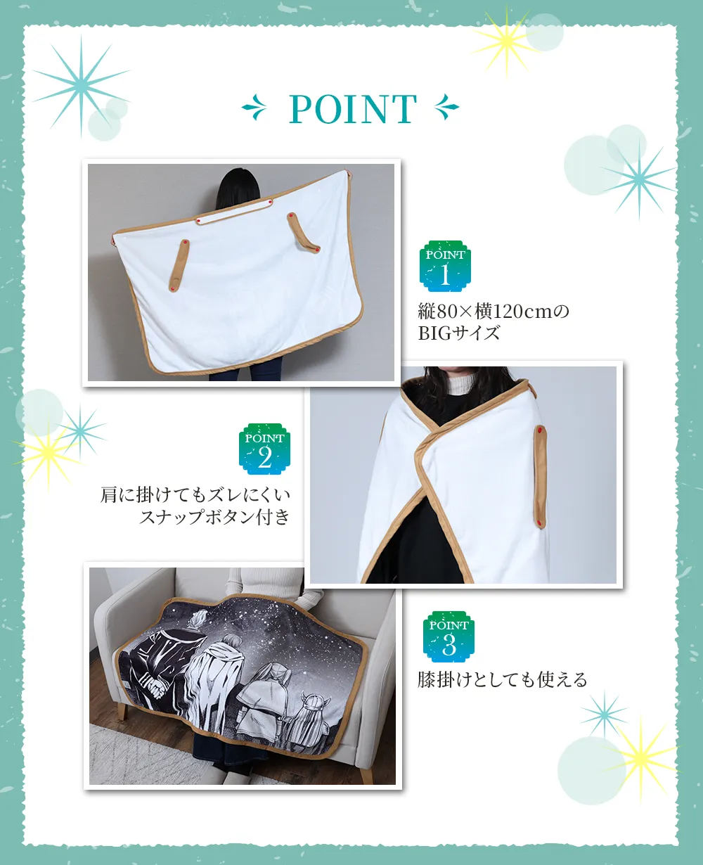 肩に掛ければフリーレン気分を味わえるというブランケットで、サイズは縦80×横120cm。肩に掛けてもずれにくいスナップボタンが付いています。