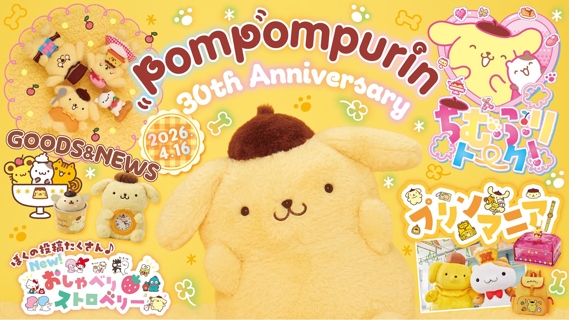いちご新聞 2026年4月号では、2026年に30周年を迎えた「ポムポムプリン」と、4月1日(水)に誕生日を迎える「バッドばつ丸」を特集。