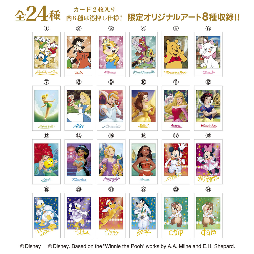 カードは全24種類で、うち8種はミッキーやミニーたちが「アイドル」テーマのオリジナルアートで登場。全24種の中からいずれか2種類がランダムで封入されます(購入前にキャラクターを選ぶことは不可)。