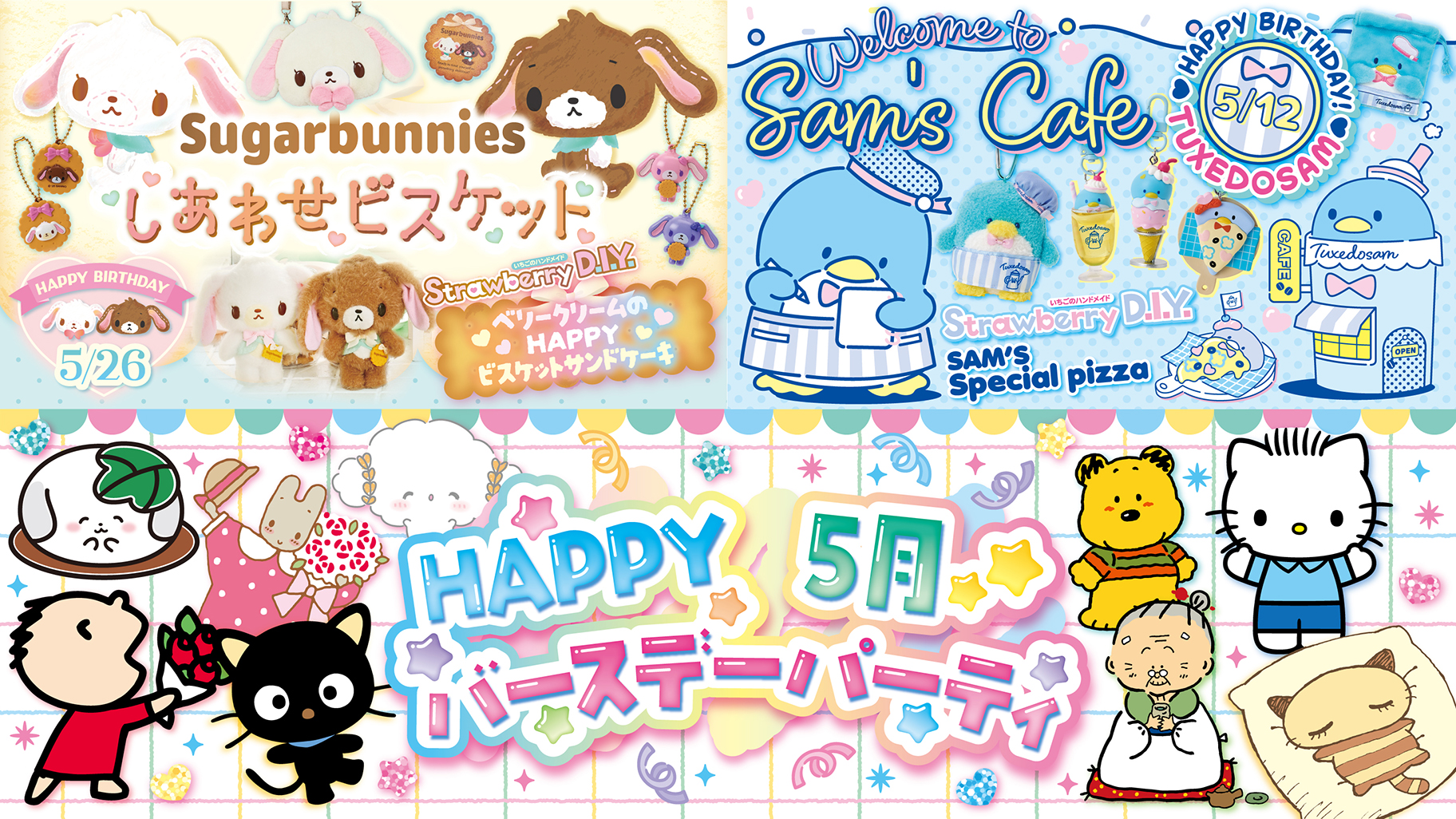 いちご新聞 2026年5月号では、5月12日(火)に誕生日を迎える「タキシードサム」、5月26日(火)に誕生日を迎える「シュガーバニーズ」を特集。